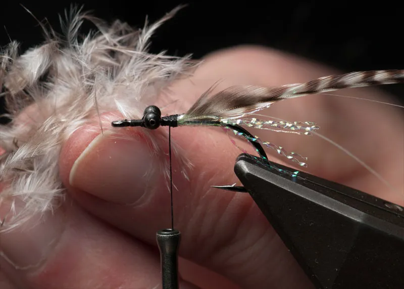 Prepare a bunch of grizzly marabou dubbing. Simpy cut off the fluffy barbs at the base of grizzly hackle