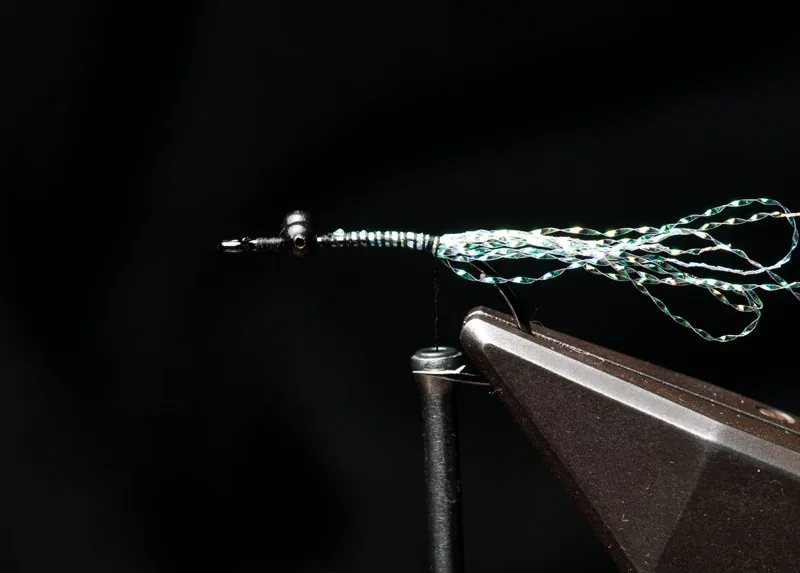 Tie in 10-15 straws of pearl flash along the full hook shank for the tail