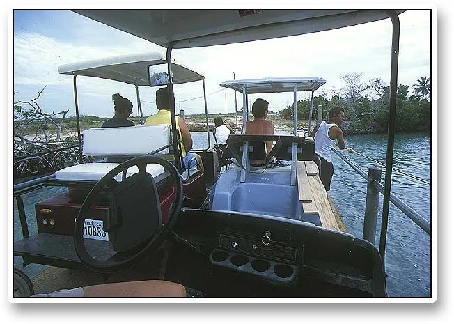 Travelling towards the north of Ambergris Caye means crossing the channel that cuts through the island. This ferry is small, clumsy, seems very unstable and is pulled over by hand. The price is BZ$ 5.- each way for a car of which the ferry can carry four - plus an unaccounted number of pedestrians and bikes.
