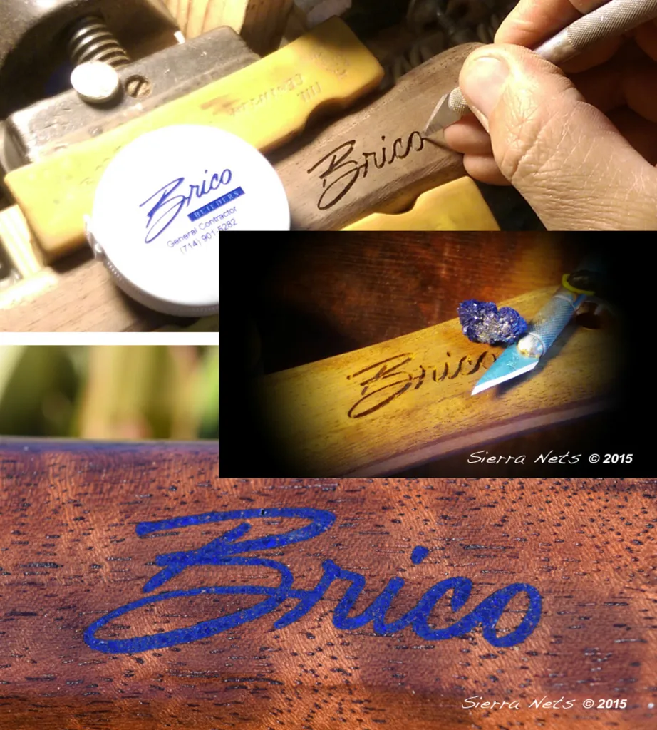 Figured claro walnut with a hand-carved client logo inlaid in azurite