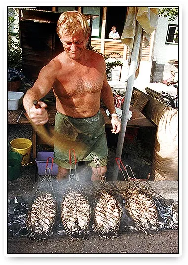 Karl-Heinz with the brook trout on the barbeque. Lots of heat and salt - and the secret oil - makes these fish extremely delicious