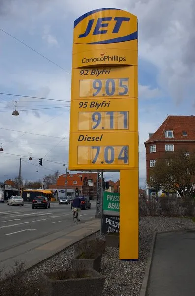 9.11 Danish Kroners per litre is a bargain. Right now the price is about 10.50 Kroners or about 1.75 US$ per litre, which amounts to 6.50 US$ per gallon!