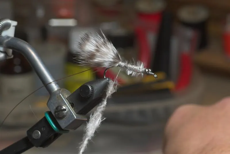 Dub the body with grizzly marabou dubbing. No wax is needed. The body should wind up quite fuzzy