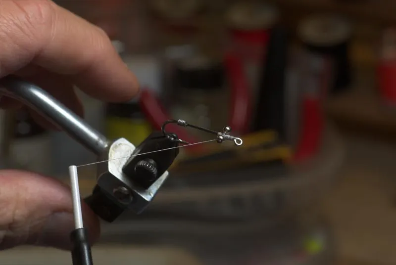 Tie on the bead chain eyes in the small dent in the tying thread. Make sure they are secured properly.