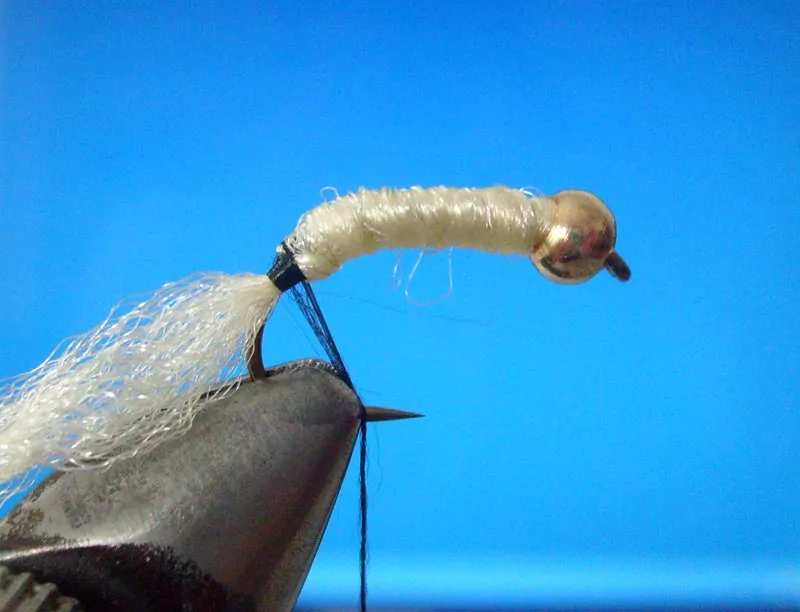 After that wrap the yarn to the bead and back to the curve to have a thicker foundation (If you use the fly as a Czech nymph - if you want it heavy - you may want to wrap a heavy wire instead of the yarn)