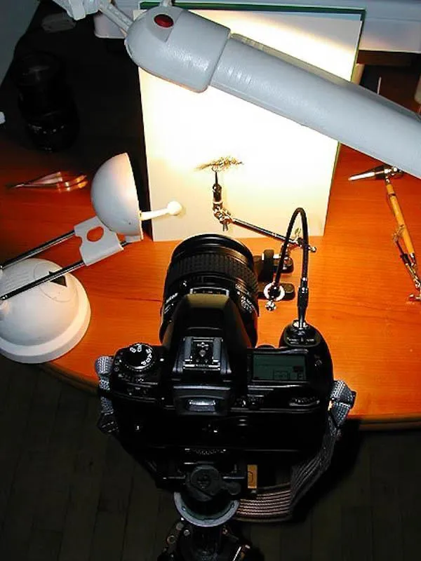 A simple two-lamp setup: a neutral light florescent lamp overhead and a cheap halogen lamp as a fill light. A piece of white paper as the background, and you're all set. Notice the "remote" trigger - an old fashioned mechanical cable trigger - which helps avoid shake.