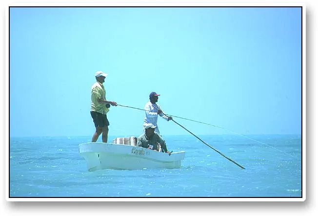 The typical tarpon setup: one person fishes (or rather waits to fish), one rests and may help spotting fish and the guide constantly works, spotting, poling and keeping the boat in an optimal position for the fisher.