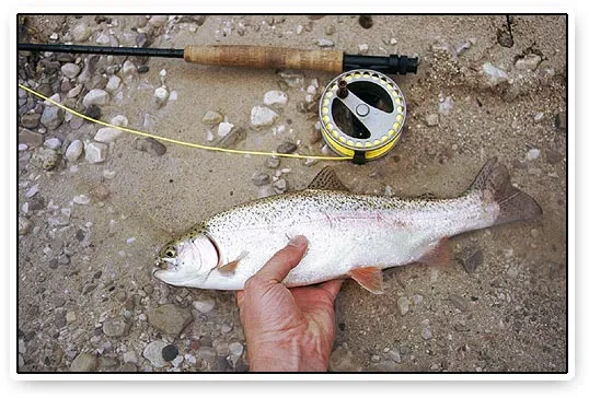 the typical condition of the Traun rainbows: stump nosed and plump. Notice the clearity of the water under the fish. "What water?" you might ask... but there is water under the reel and over the tail of the fish!