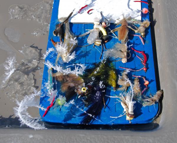 Hoar frost on drift boat fly patch. North Platte River, Wyoming, 18 degrees at 9:30 A.M. Camera: Nikon D-80